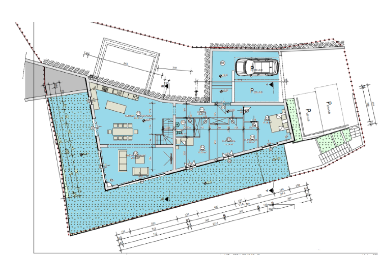 On the lower level you can find a home cinema room, study space, storage room and additional room that you can adapt to your needs. Additionally, on the same floor, there is another apartment also under ownership. This apartment has a separate entrance and includes two bedrooms, a bathroom, and a small terrace overlooking greenery. It is equipped with underfloor heating, providing extra comfort and privacy. The apartment is surrounded by a landscaped garden, offering a spacious parking area for four vehicles, two of which are in a door-less garage. Moreover, on the right side of the terrace, there is a heated infinity pool that further enhances the quality of life and offers a perfect spot for relaxation.