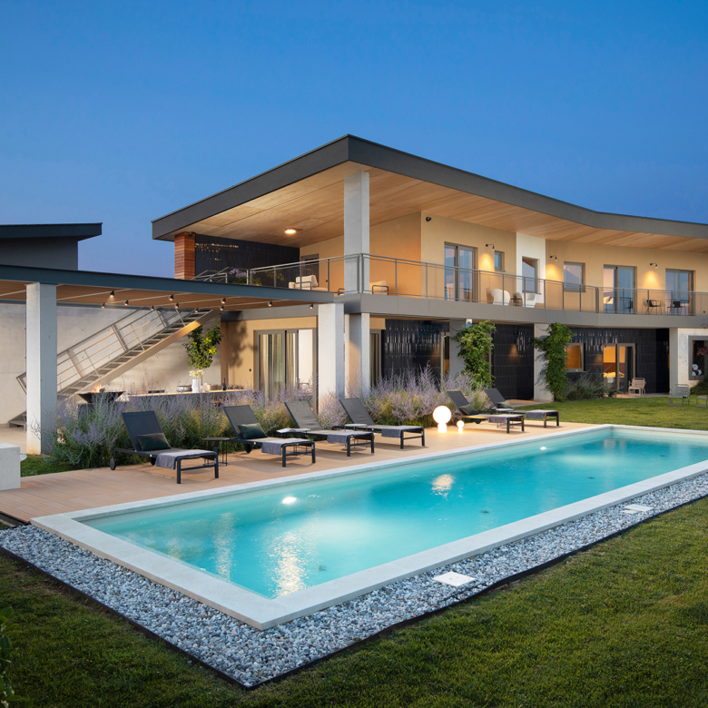 Kompleks treh čudovitih novozgrajenih vil se nahaja v mirnem stanovanjskem delu vasi in ponuja nepopisno lep razgled na bližnje Brione, oljčne nasade in vinograde.